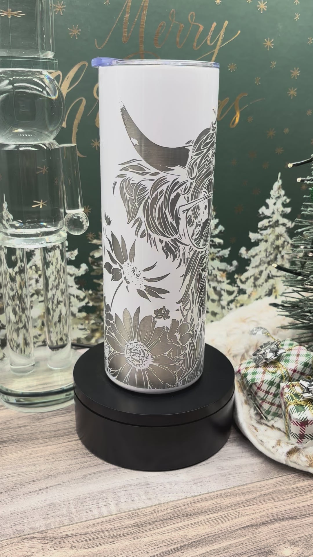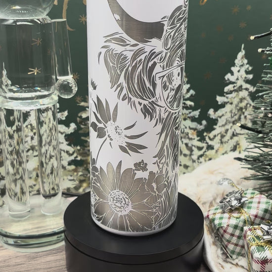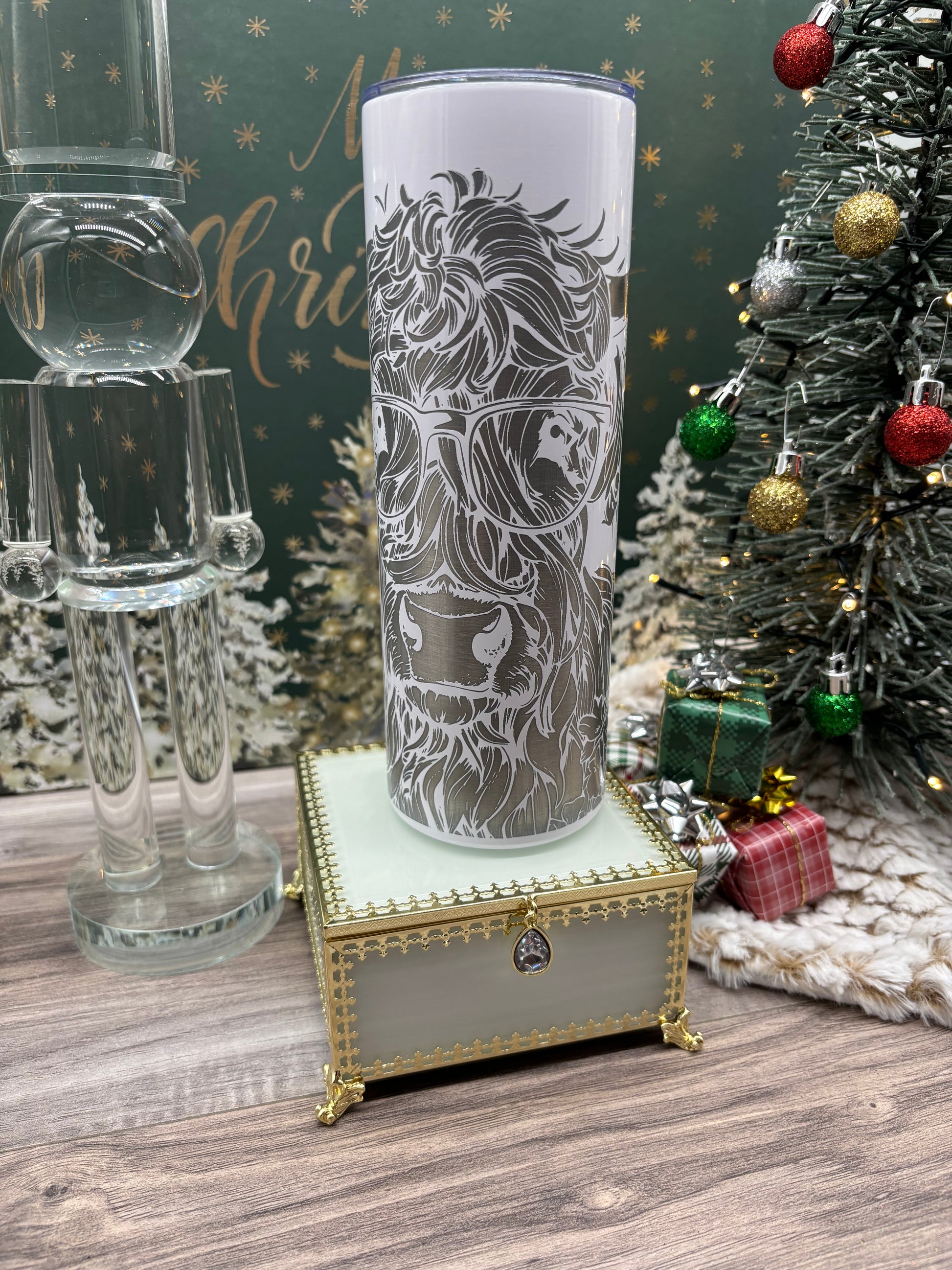 20oz Skinny Tumbler Engraved with a Highland Cow with Glasses