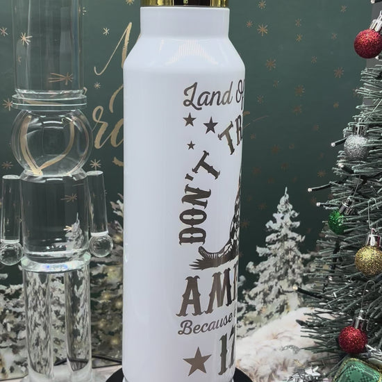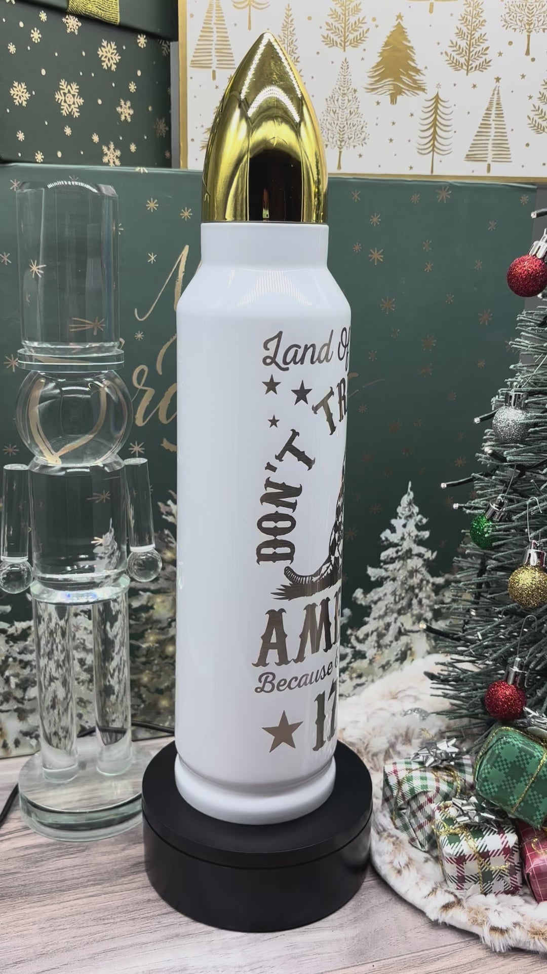 Stand out with this distinctive 32oz bullet-shaped tumbler, engineered for those who embrace patriotic values. Constructed from durable stainless steel with advanced double-wall insulation technology, it maintains optimal beverage temperatures throughout your day. Each tumbler features precision laser engraving of iconic "Don't Tread on Me" imagery alongside 1776 detailing, creating a striking tribute to American independence and constitutional principles. Perfect for Second Amendment advocates and gun enthusiasts seeking functional gear that reflects their patriotism. This conversation-starting drinkware serves as a thoughtful, one-of-a-kind gift for patriots who demand both quality and meaning in their everyday essentials.