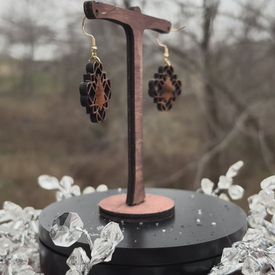 These earrings are laser cut, then hand painted with metallic watercolors. UV resin is then applied to bring out the beautiful grain and color of this natural solid hard wood.