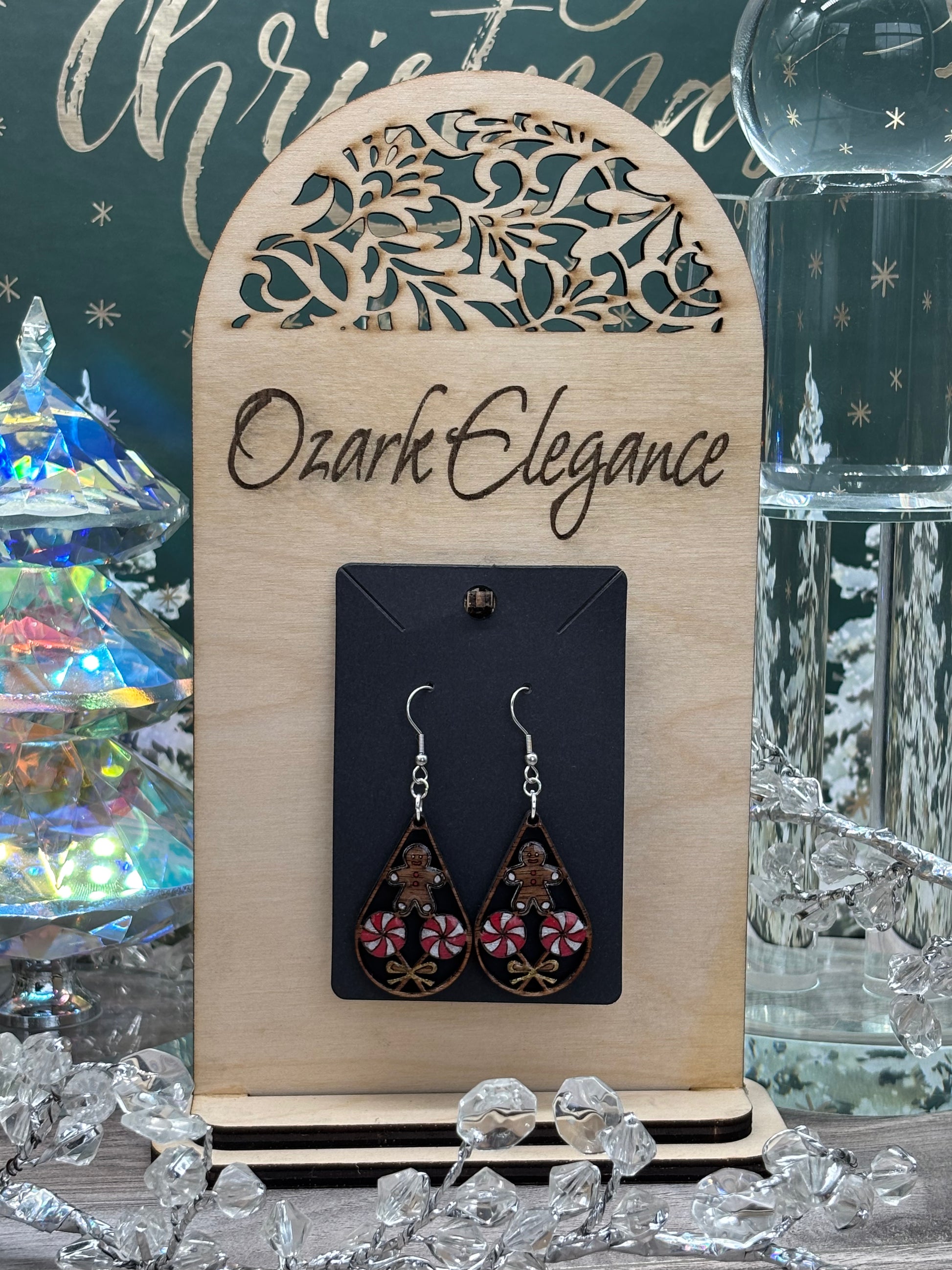 Expertly crafted from solid black walnut, these festive earrings unite laser engraving with hand-painted artistry to bring gingerbread man designs to life. The precision of modern engraving complements the warmth of traditional hand-painting, creating distinctive visual depth across the wood's natural grain. Each singular pair captures the spirit of the season through a sophisticated blend of contemporary technique and artisanal skill.