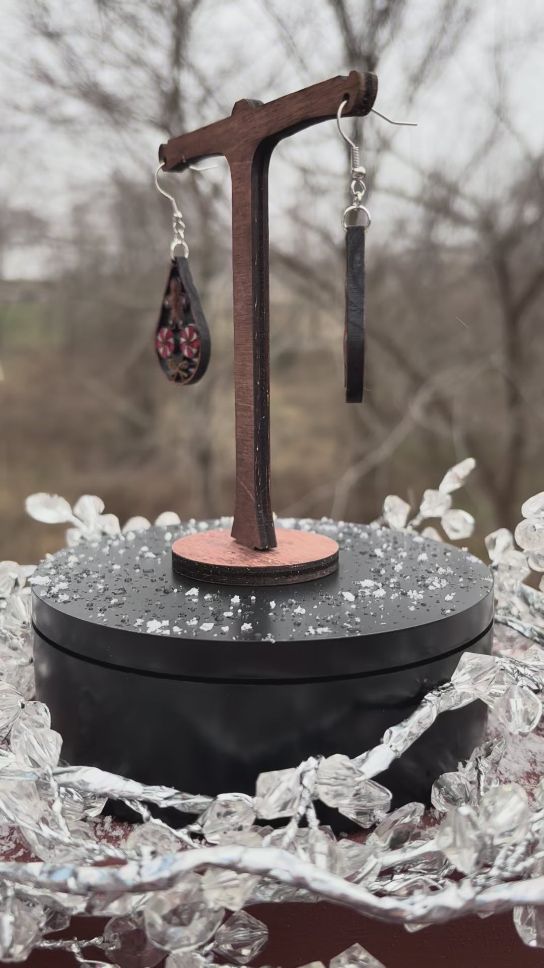 These earrings are laser cut, then hand painted with metallic watercolors. UV resin is then applied to bring out the beautiful grain and color of this natural solid hard wood.