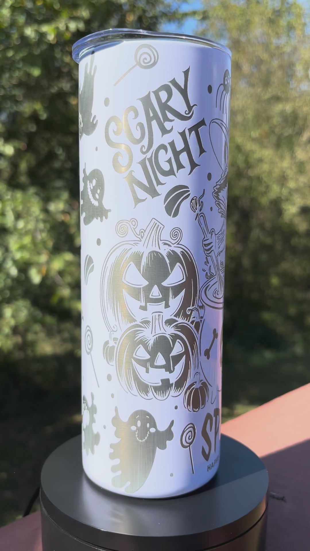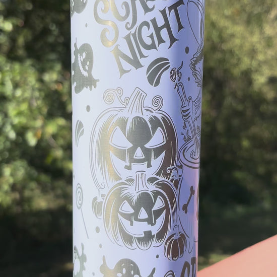 Celebrate Halloween in style with this 20oz double-walled tumbler featuring a laser-engraved raccoon witch and festive ghost design. Crafted for durability and insulation, it keeps your beverages hot or cold while showcasing a charming Jack-O-Lantern theme. Perfect for adding a cute, spooky touch to your seasonal drinks.
