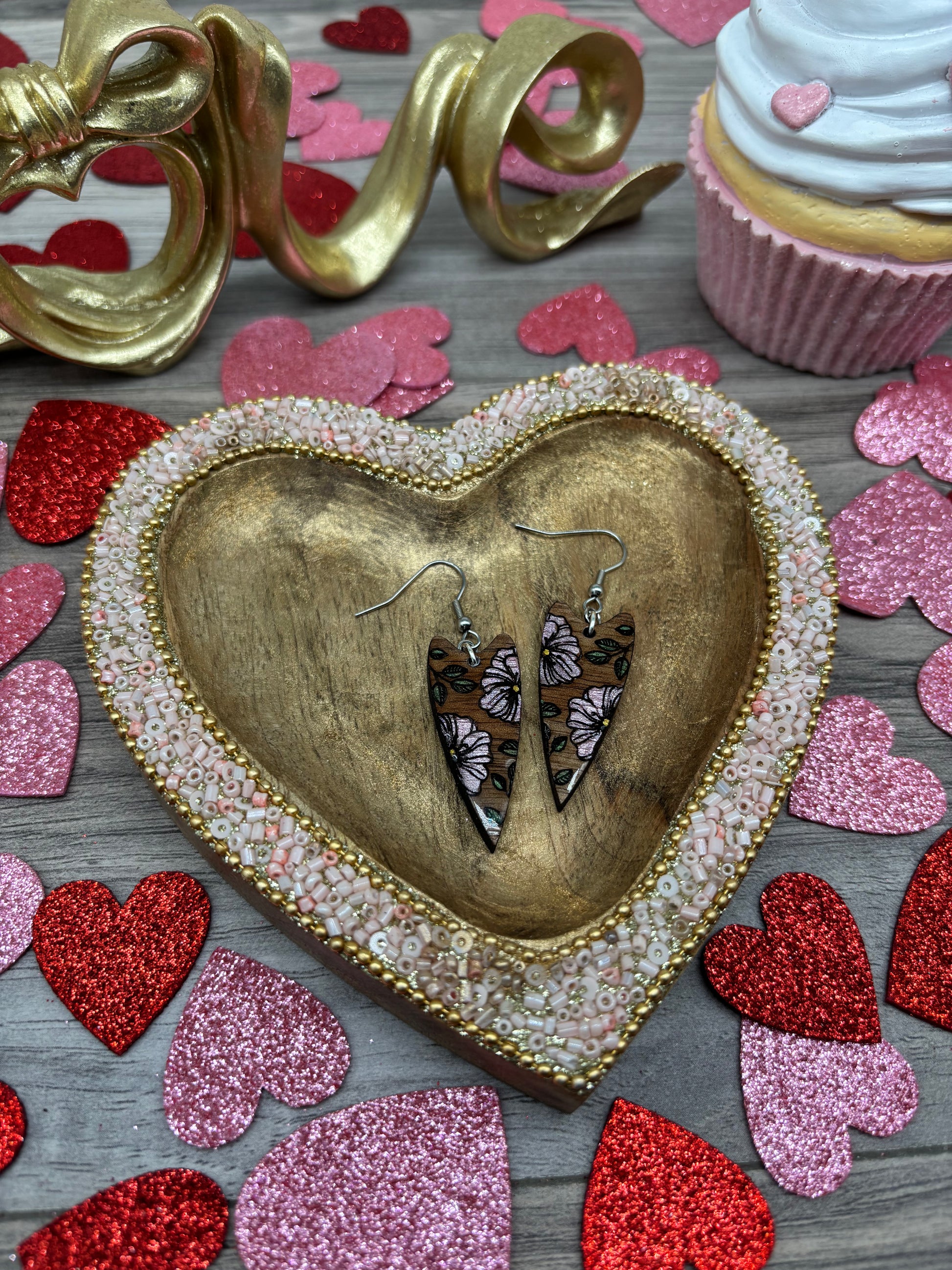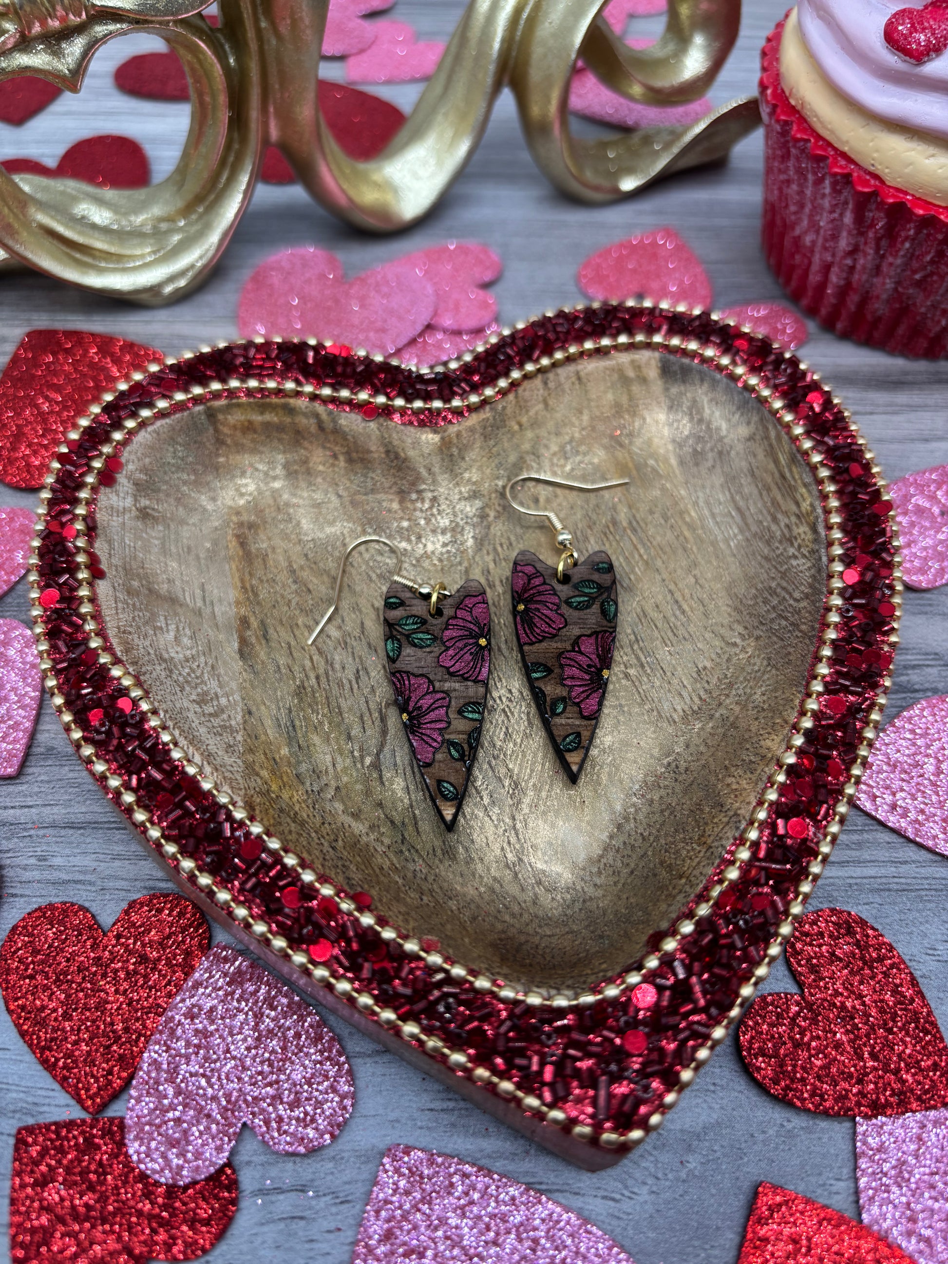 Floral Heart Drop Earrings – Laser Engraved & Hand Painted Black Walnut Wood