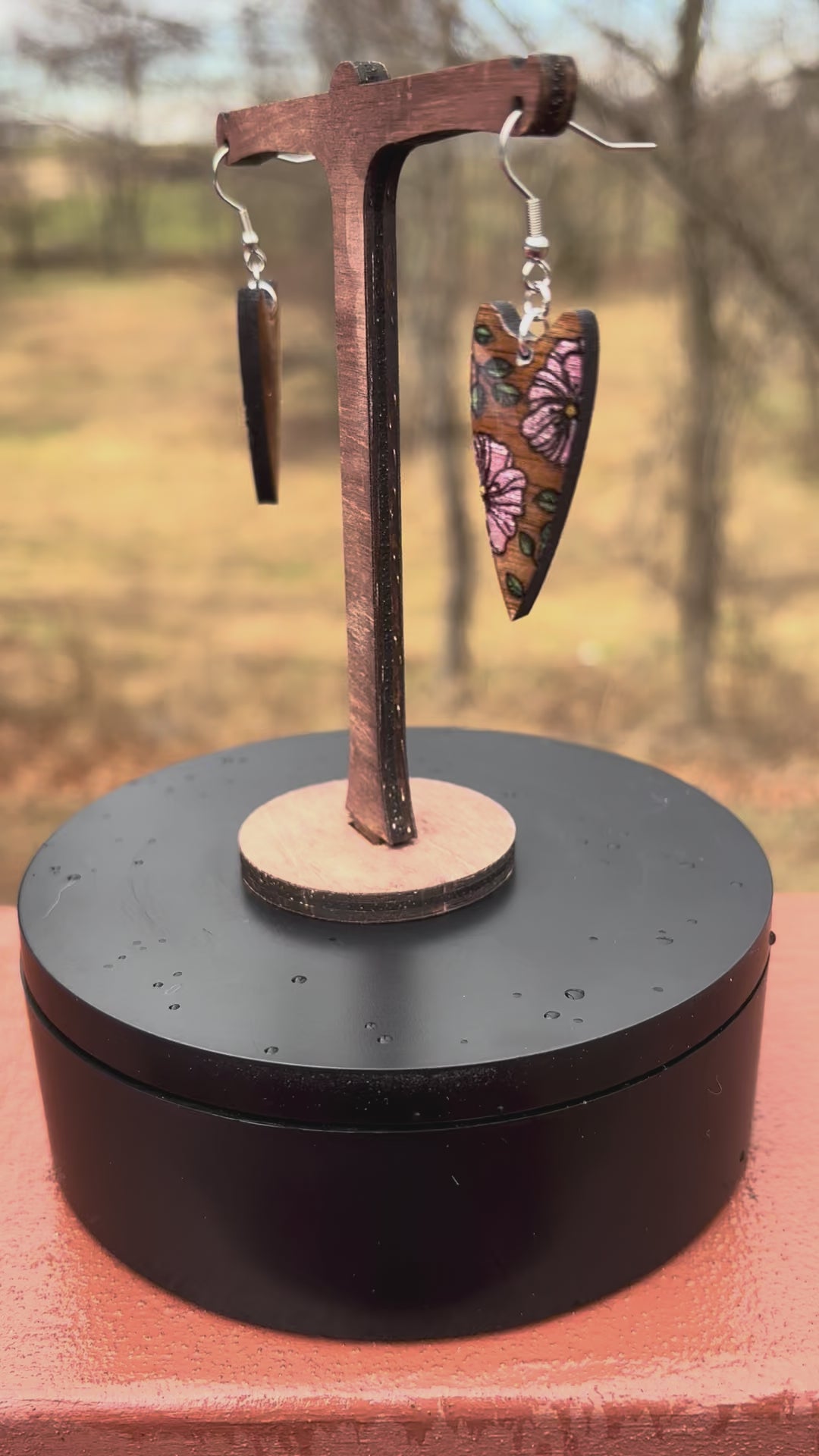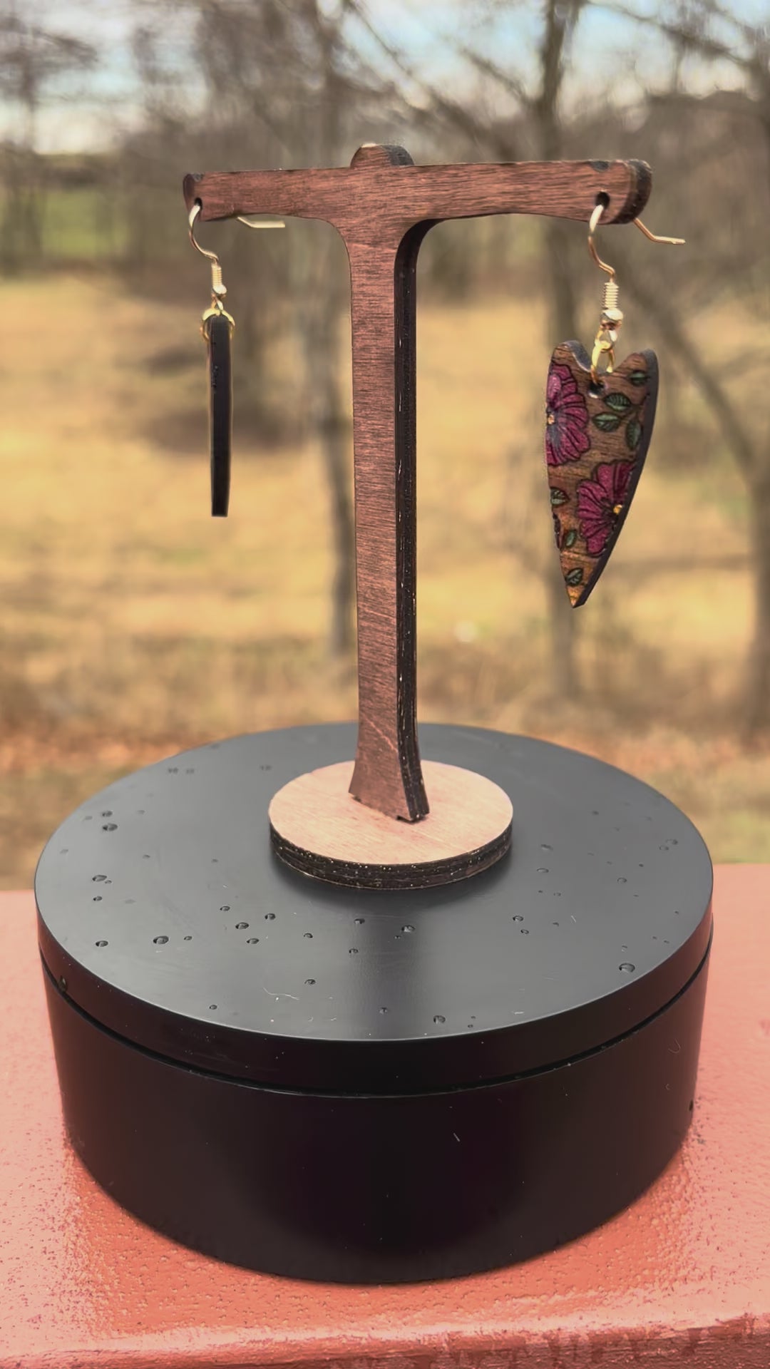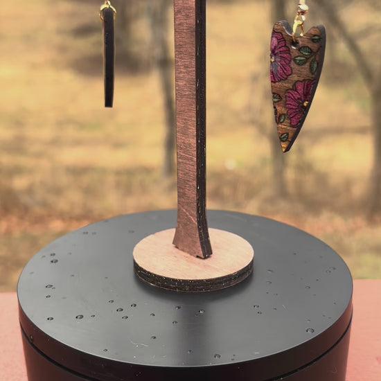 These floral heart drop earrings are handcrafted from solid black walnut wood and designed to highlight both natural beauty and detailed artistry. Each pair is laser engraved with an elegant floral pattern, then hand painted to bring depth and warmth to the design while allowing the rich wood grain to remain visible.