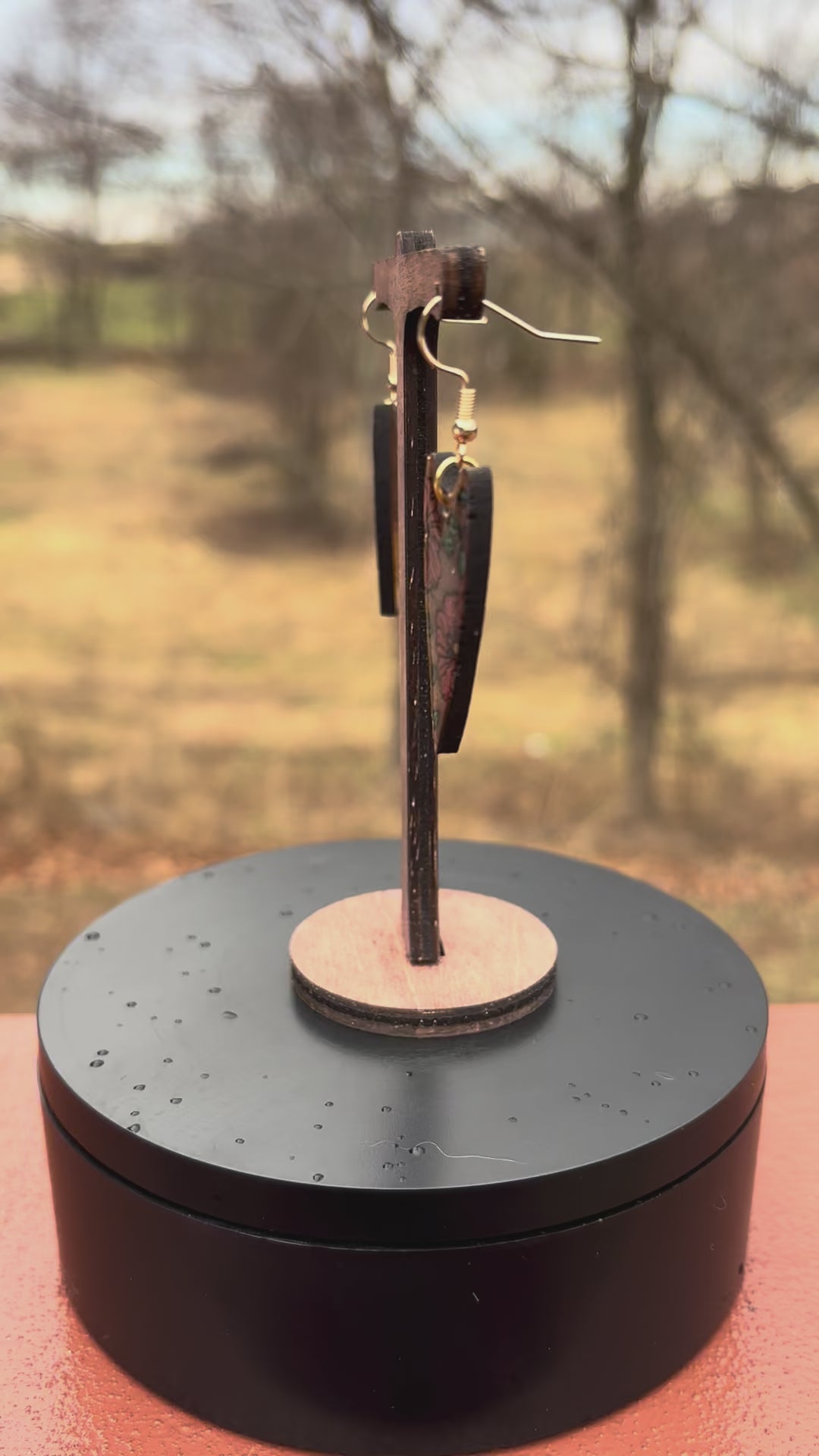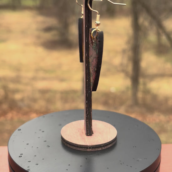 These earrings are laser cut, then hand painted with metallic watercolors. UV resin is then applied to bring out the beautiful grain and color of this natural solid hard wood.