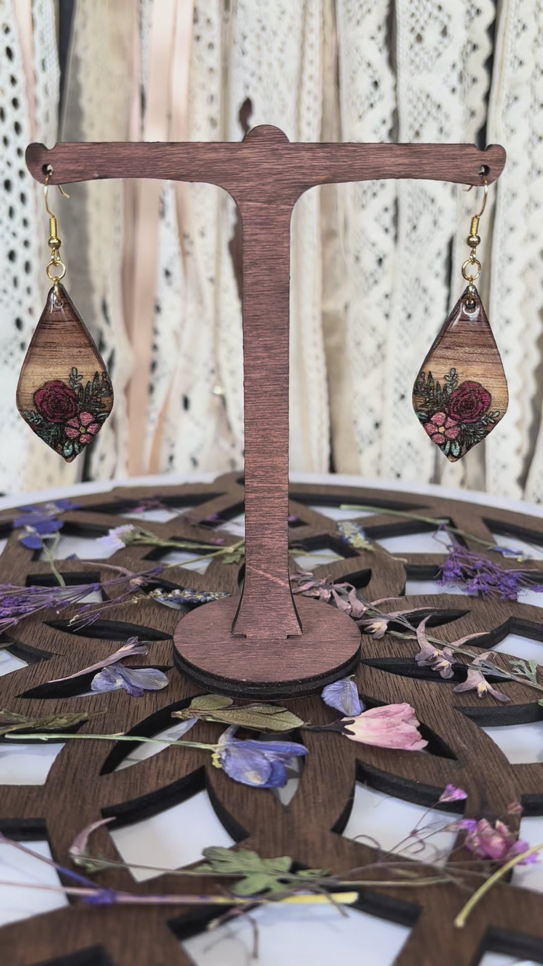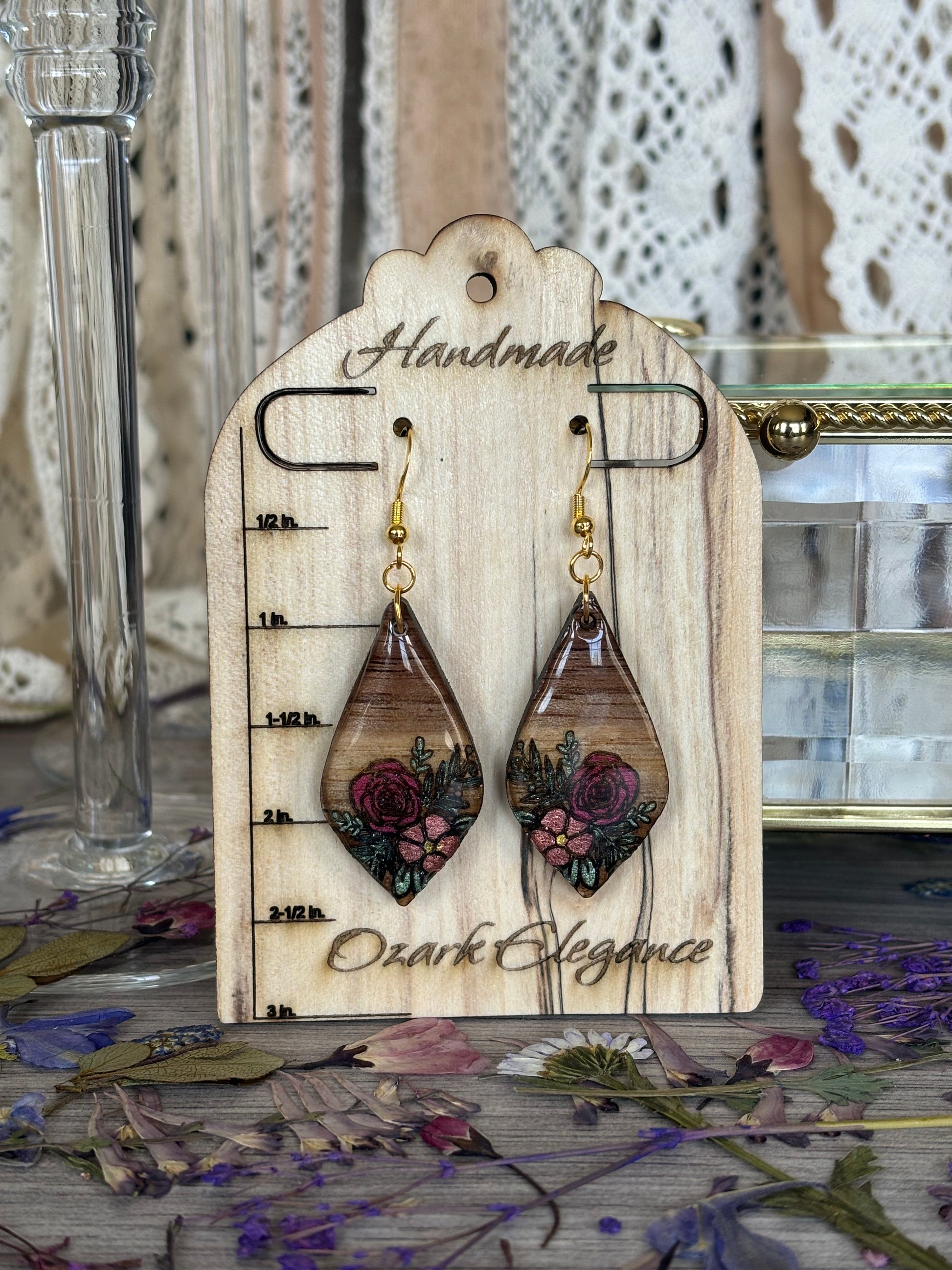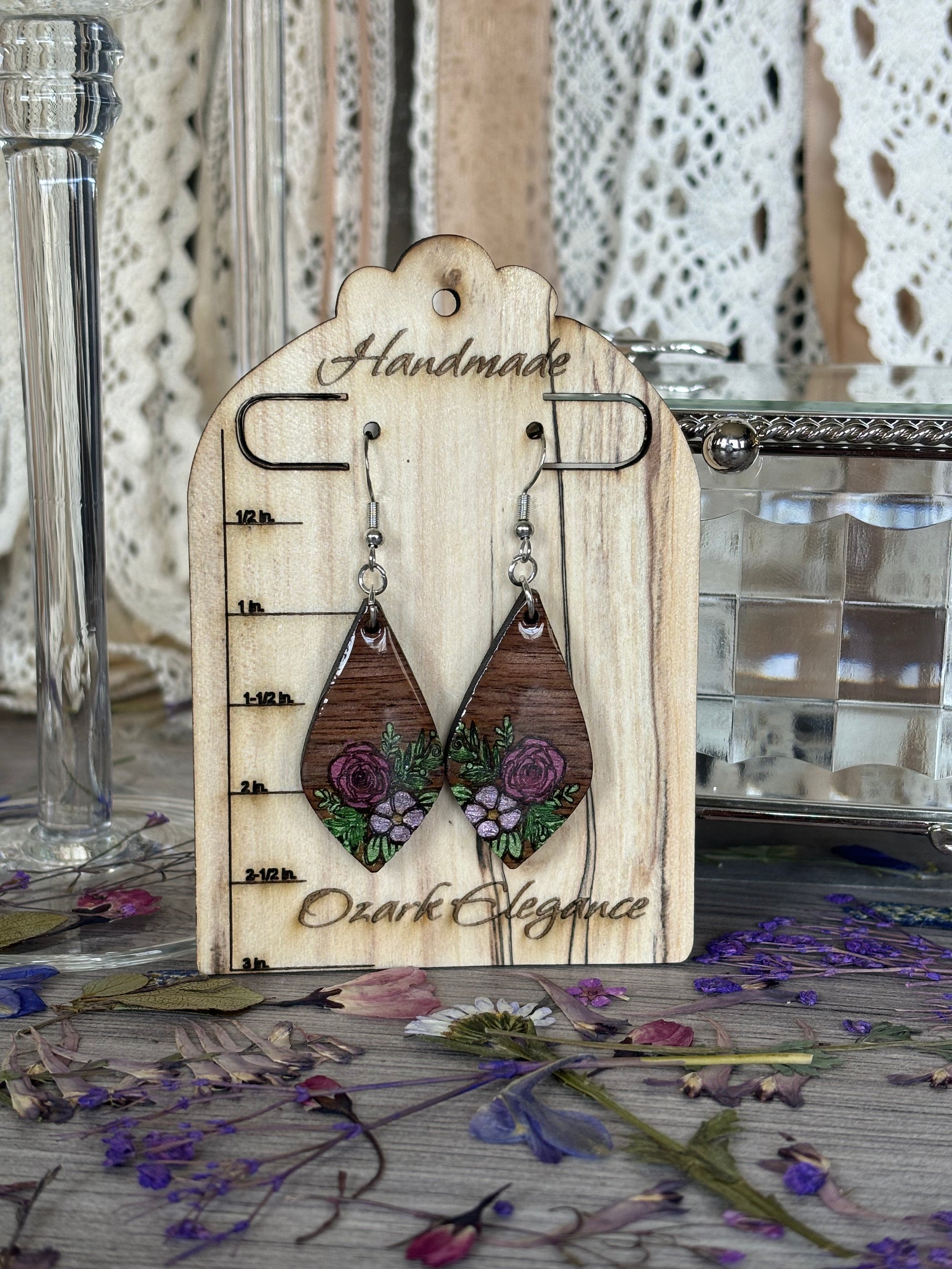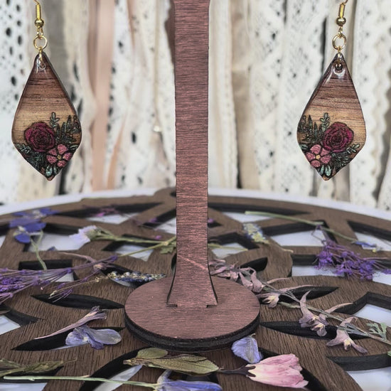 Crafted from solid black walnut wood harvested in the Ozarks, these earrings combine natural durability with refined elegance. Each pair is meticulously hand-painted, resined, and laser-engraved, allowing for precise, custom designs that make every piece uniquely yours. Their lightweight yet sturdy construction ensures comfortable wear while showcasing expert craftsmanship in fine wood jewelry. Ideal for those seeking a sophisticated accessory with a personal touch.