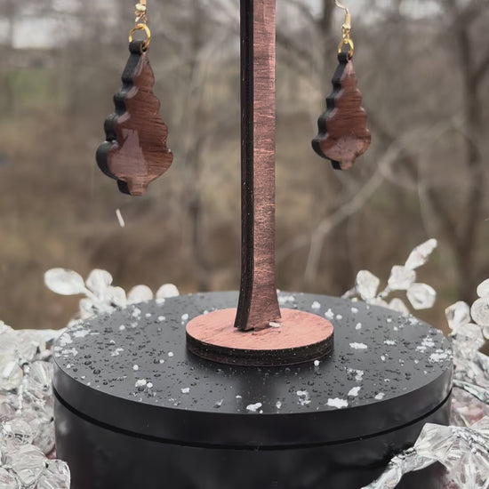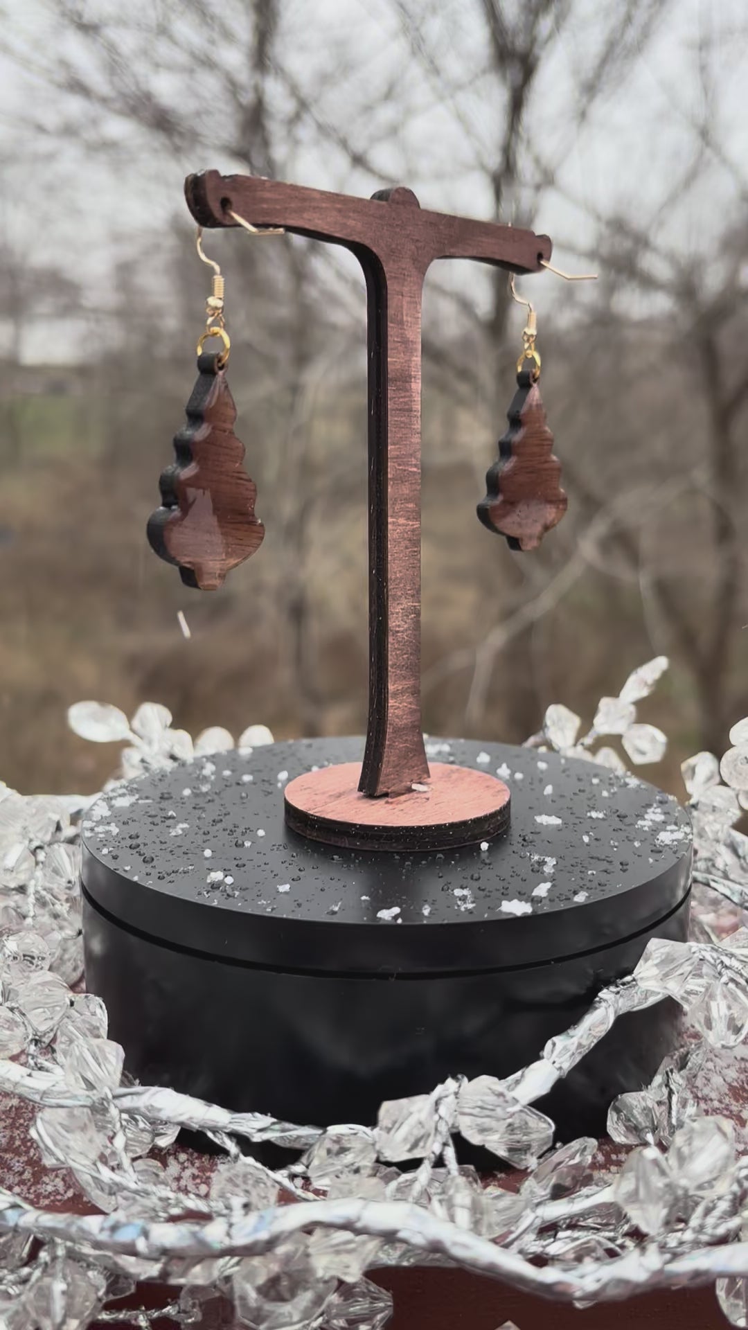 These artisan earrings showcase the natural beauty of solid black walnut, expertly combined with hand-painted holiday imagery and precision laser engraving. This Christmas tree design captures seasonal charm while maintaining sophisticated elegance. The lightweight walnut construction ensures comfortable all-day wear, while the meticulous craftsmanship—from painted details to engraved accents—demonstrates genuine attention to detail. A refined choice for those seeking one-of-a-kind festive accessories that reflect superior artisanal quality.