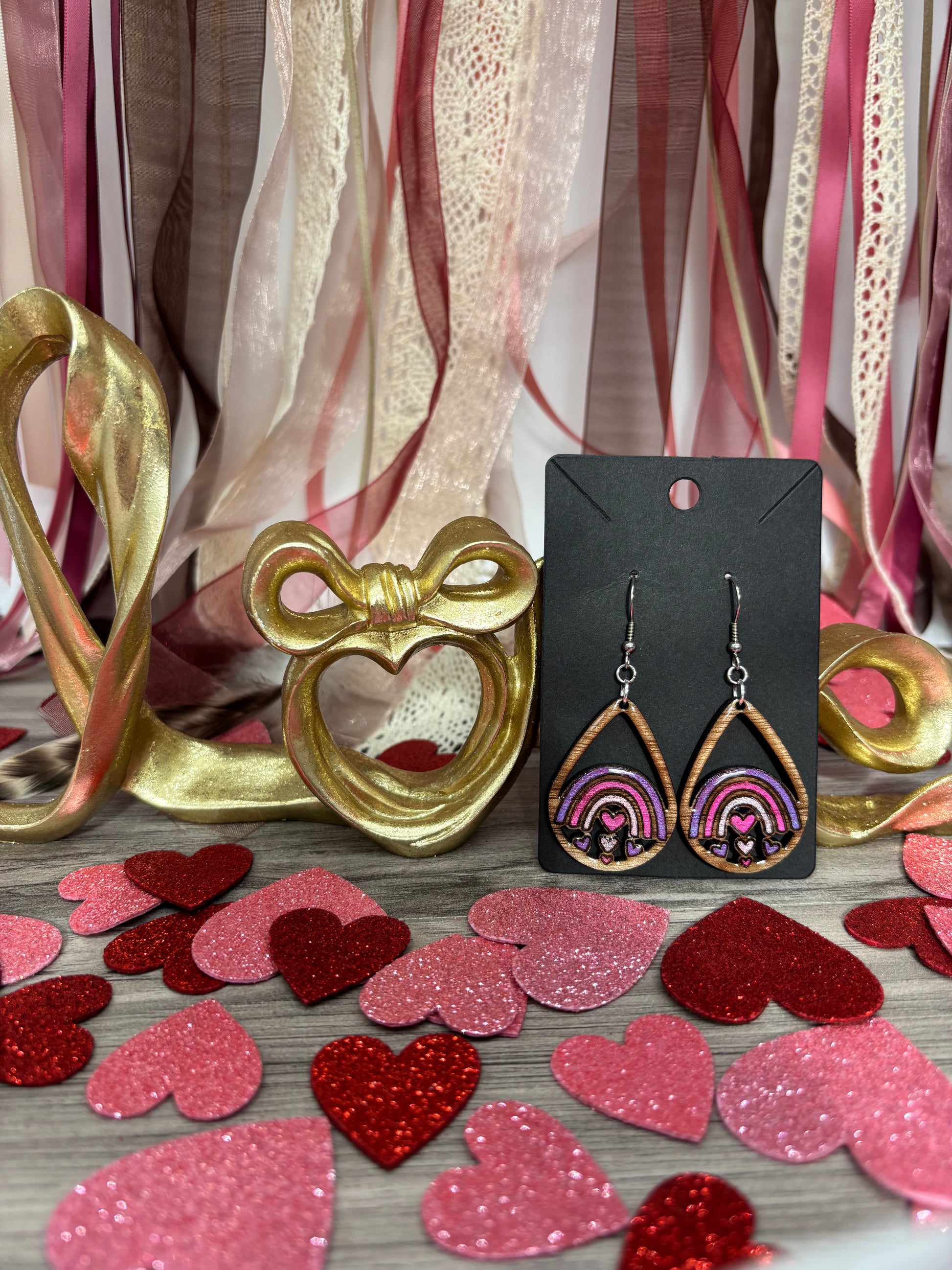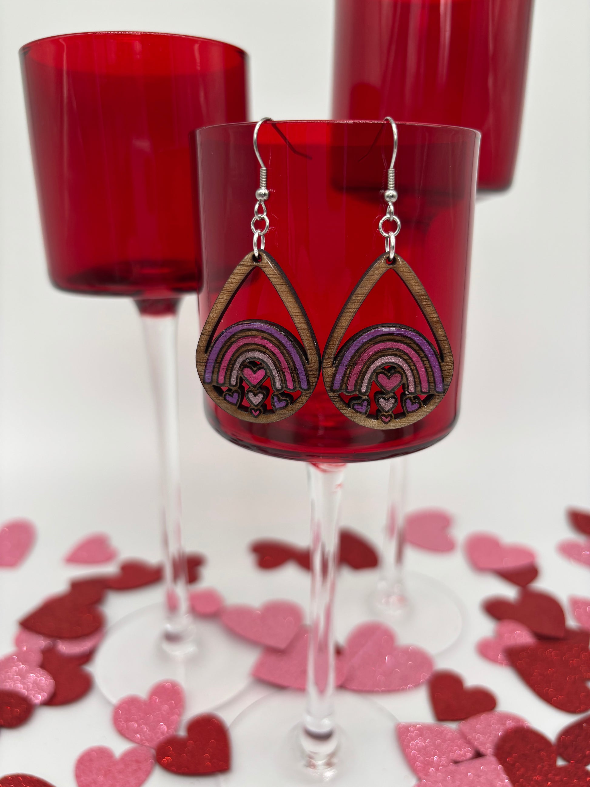 Add a playful yet romantic touch to your look with these heart rainbow teardrop earrings, crafted from solid black walnut wood. Each earring features a beautifully laser engraved rainbow design accented with heart details, then carefully hand painted in warm red and pink tones that highlight the design while allowing the natural wood grain to shine through.