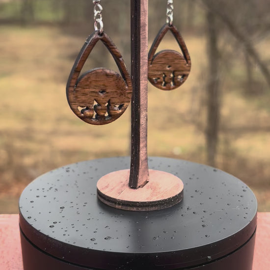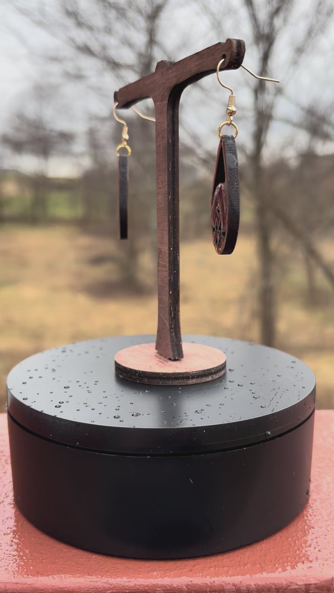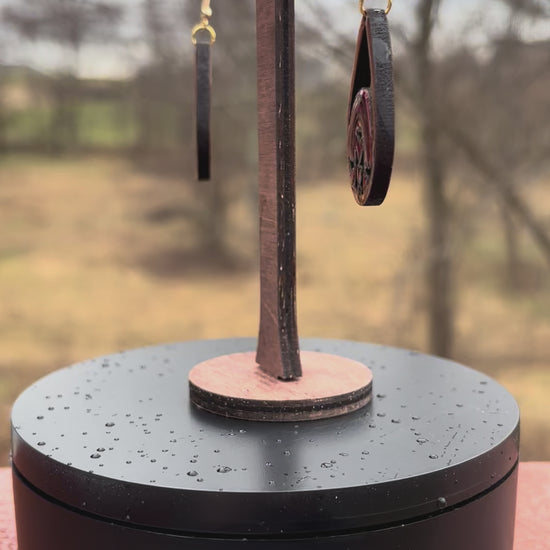 These earrings are laser cut, then hand painted with metallic watercolors. UV resin is then applied to bring out the beautiful grain and color of this natural solid hard wood.