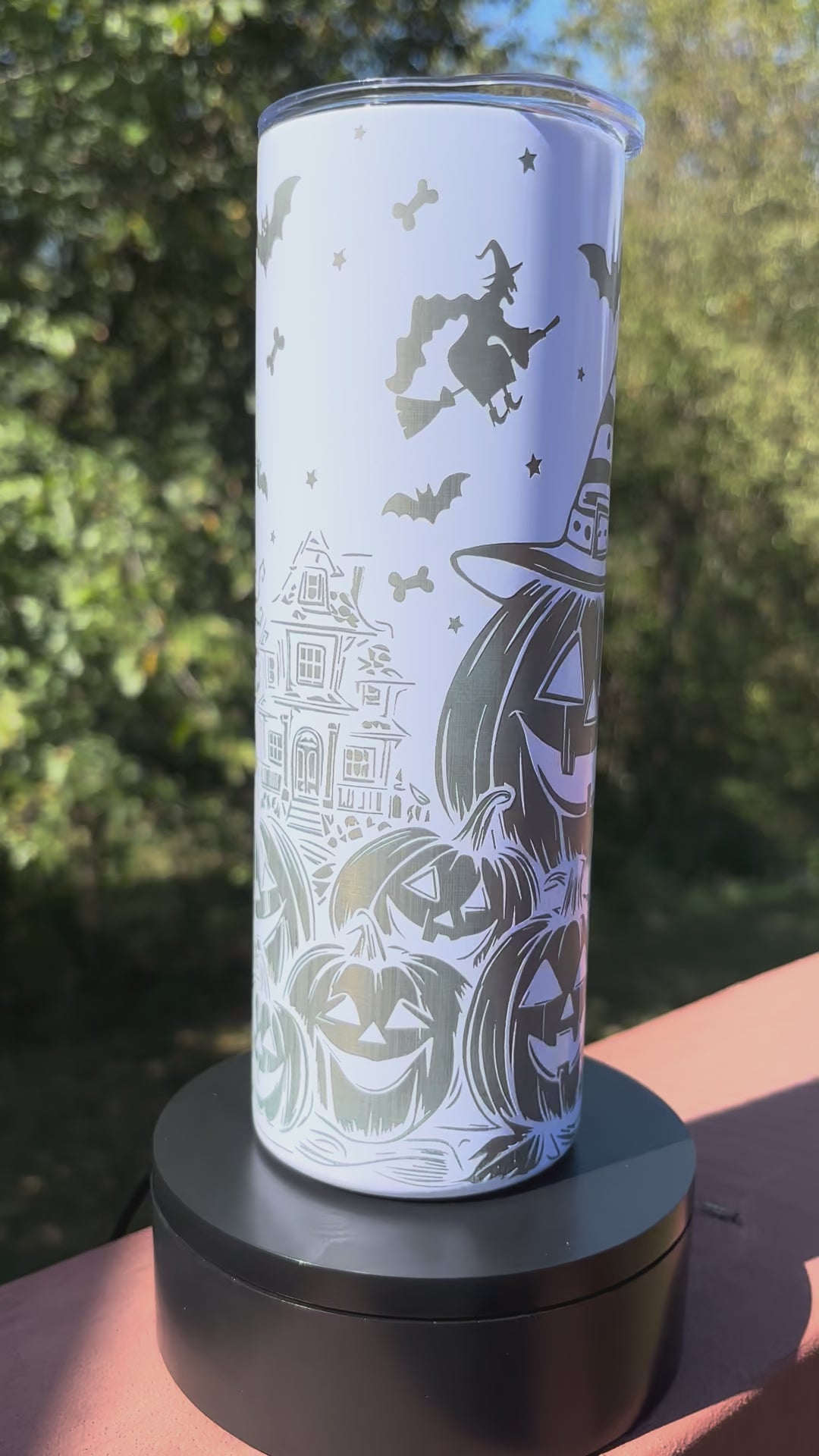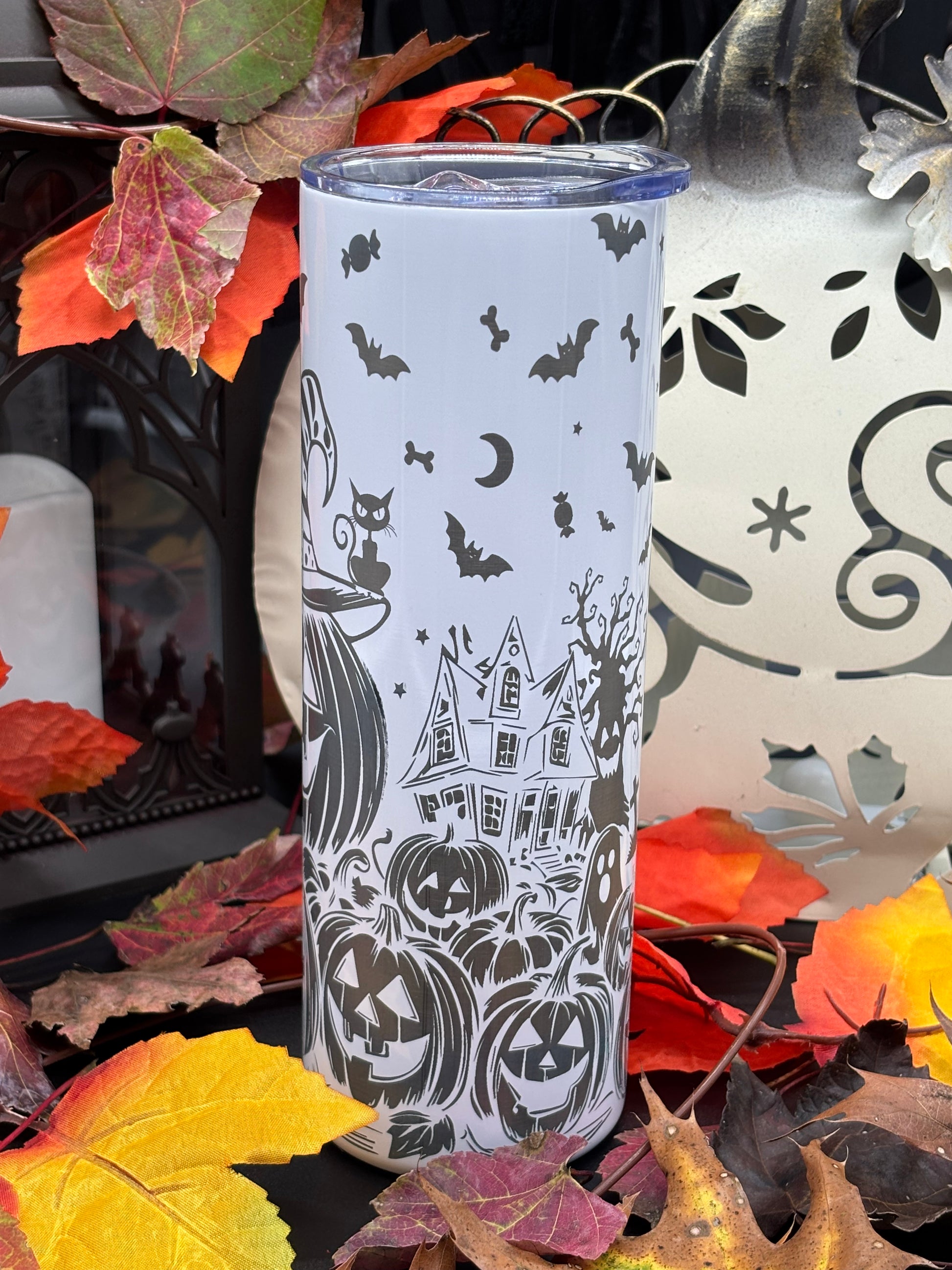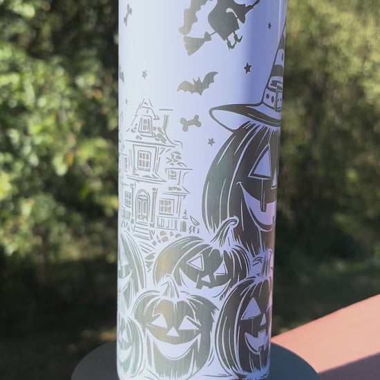 This 20oz skinny tumbler features precise laser engraving for a sharp, custom Jack-O-Lantern design that enhances its Halloween appeal. Double-walled construction keeps drinks hot or cold longer while preventing condensation. Its slim profile fits comfortably in your hand and most cup holders, combining festive style with practical usability.