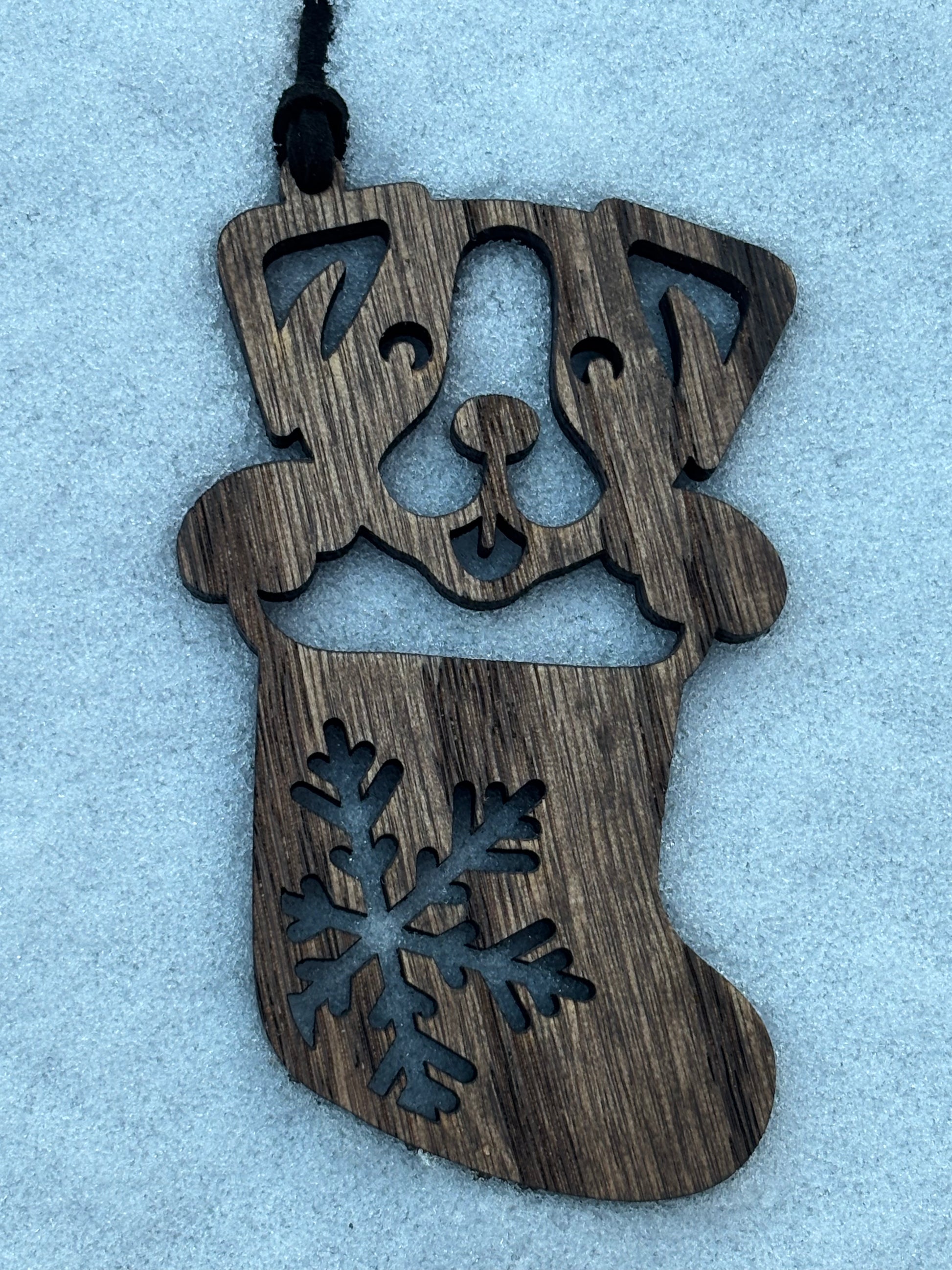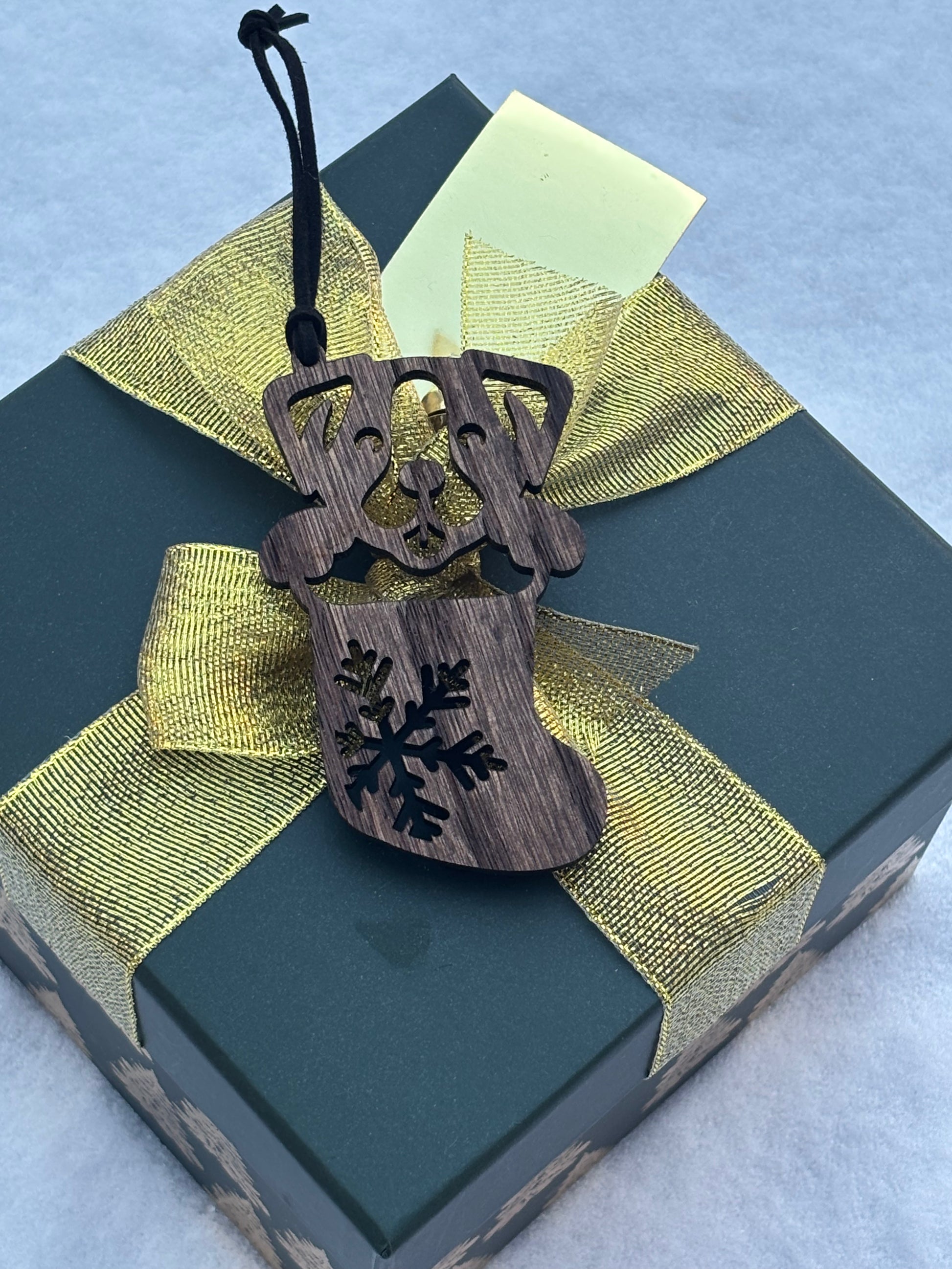 This laser-cut solid oak puppy in a stocking ornament exemplifies precision craftsmanship and holiday sophistication. The intricate geometric patterns are achieved through advanced laser technology, creating sharp, detailed edges that showcase the wood's natural beauty. A carefully applied stain deepens the grain while maintaining the ornament's elegant aesthetic. Ideal for discerning collectors, this piece merges festive tradition with contemporary artisanal technique, making it a standout addition to any holiday collection.