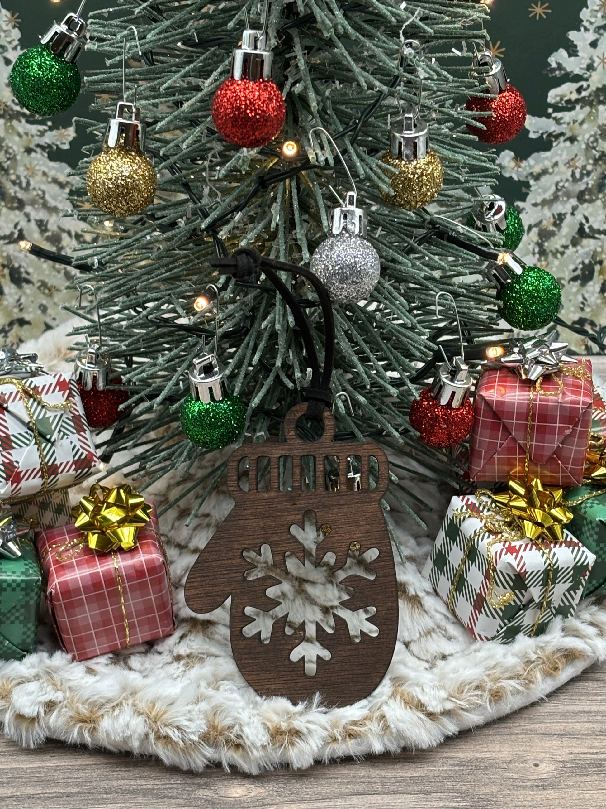 This laser-cut solid oak mitten with snowflake ornament exemplifies precision craftsmanship and holiday sophistication. The intricate geometric patterns are achieved through advanced laser technology, creating sharp, detailed edges that showcase the wood's natural beauty. A carefully applied stain deepens the grain while maintaining the ornament's elegant aesthetic. Ideal for discerning collectors, this piece merges festive tradition with contemporary artisanal technique, making it a standout addition to any holiday collection.