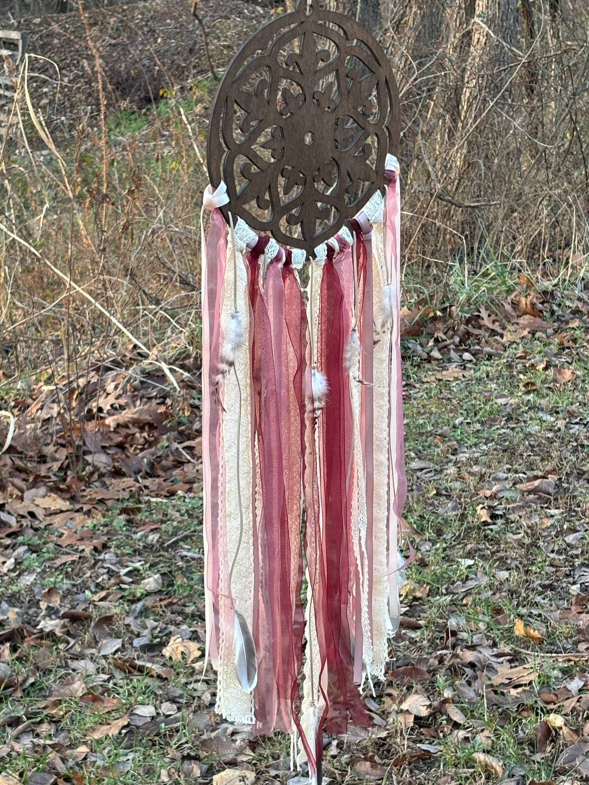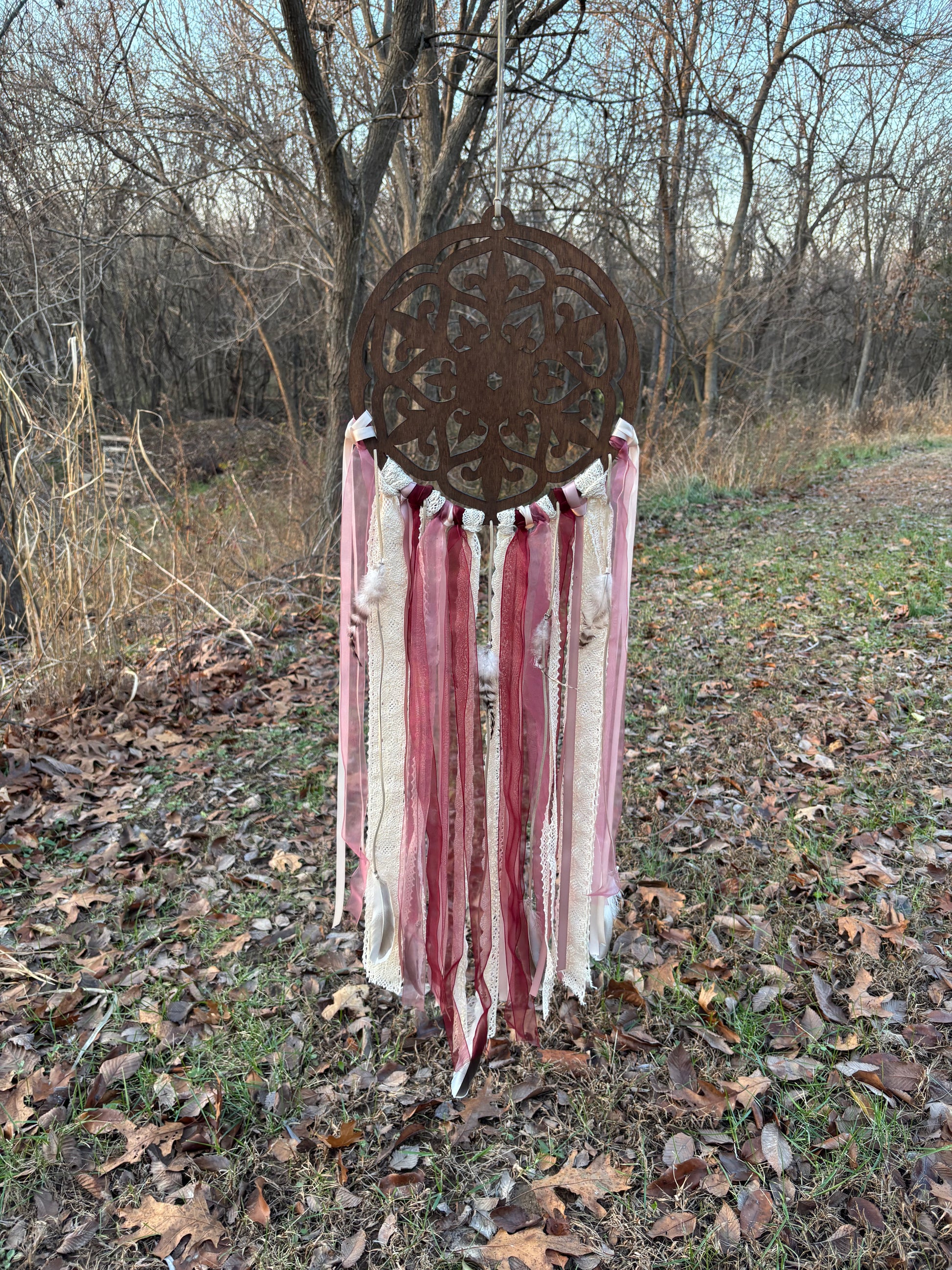 Wooden Dreamcatcher with Delicate Lace and Flowing Ribbons
