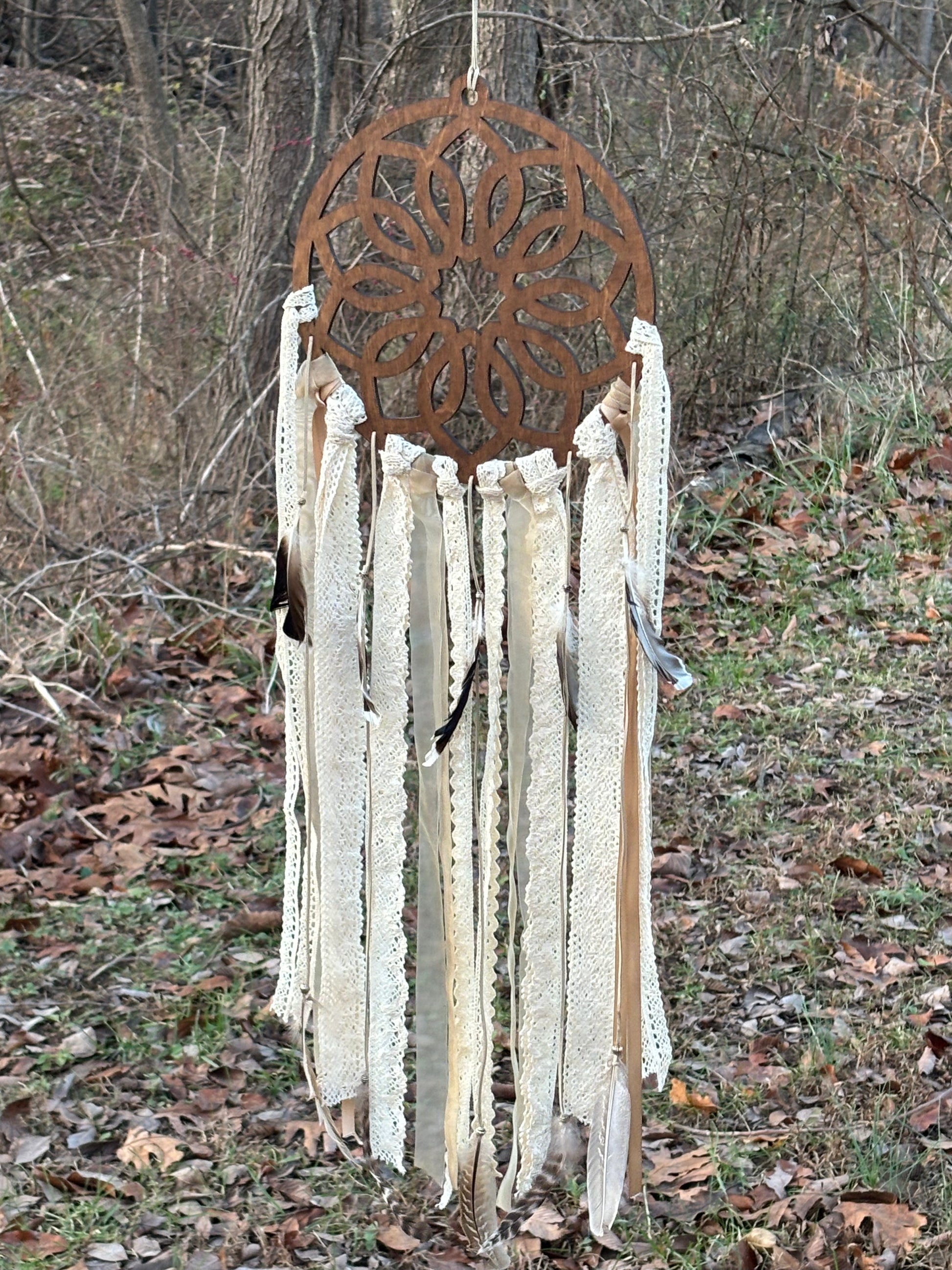Wooden Dreamcatcher with Delicate Lace and Flowing Ribbons